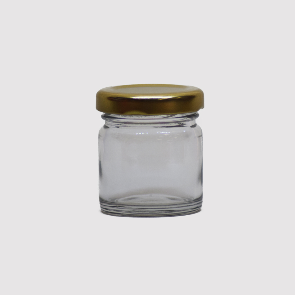 Βαζάκι από διάφανο γυαλί. Περιλαμβάνεται καπάκι μεταλλικό χρυσό Φ43, με εσωτερική επένδυση για τέλεια στεγανοποίηση.